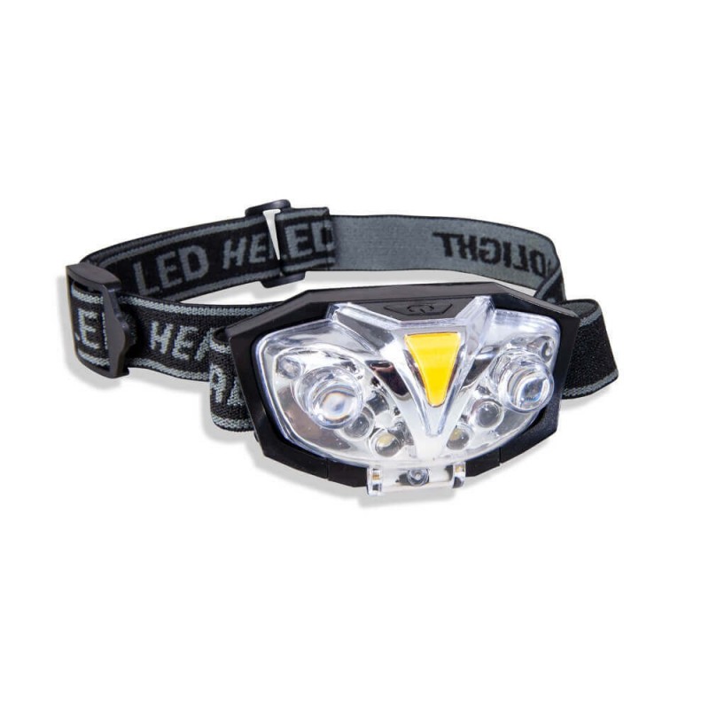 Head lamp with 2 UV, red and white LEDs each. The lamp can also be tilted by 90 °. It is operated with 3x AAA batteries (not included).